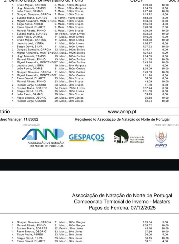Realizou-se no passado dia 7 de Dezembro de 2025 o Campeonato Territorial Inverno de Natação Masters na Piscina Municipal de Paços de Ferreira. Parabéns a todos os atletas do CDUP pelos resultados e pódios que culminaram num 5ª lugar em Absolutos.